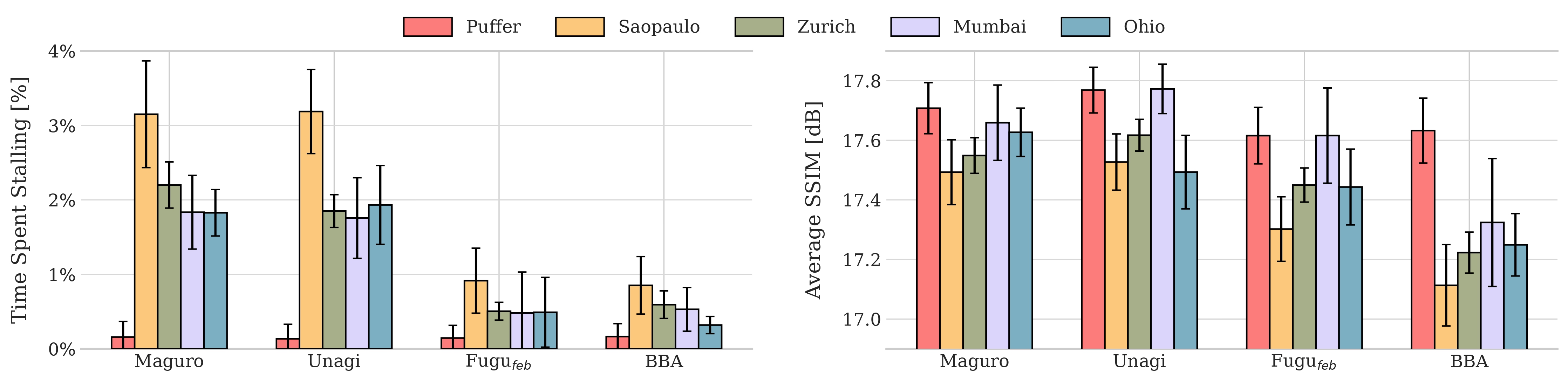 Overall, our results highlight both the value and necessity of ABR-Arena: QoE performance varies significantly across real-world environments, and comparisons with prior work reveal how much ML-based ABR performance can diverge between training and deployment. A reliable evaluation of these algorithms can only be done by testing them across diverse regions with varying network conditions.